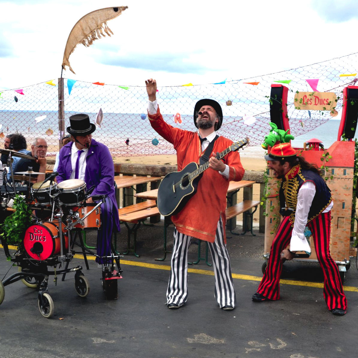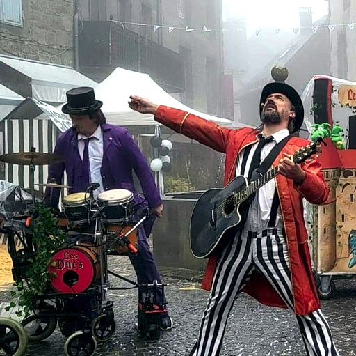 Les Ducs investissent cours, places, trottoirs, ruelles, foirail et places du mail avec leur mini château sur roues et proposent un répertoire de chansons empruntées aux trublions de la langue de Molière :
